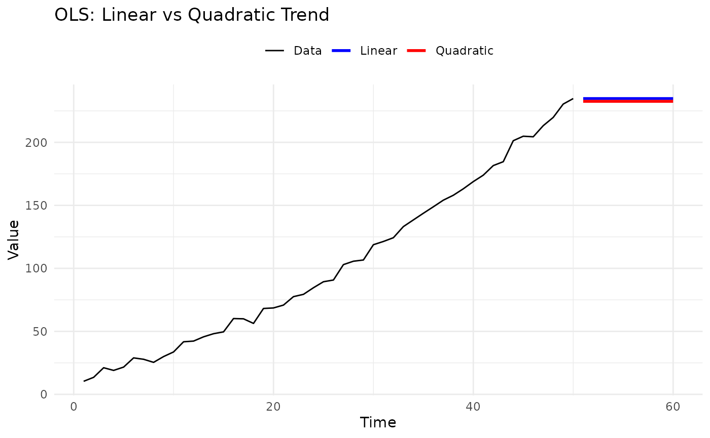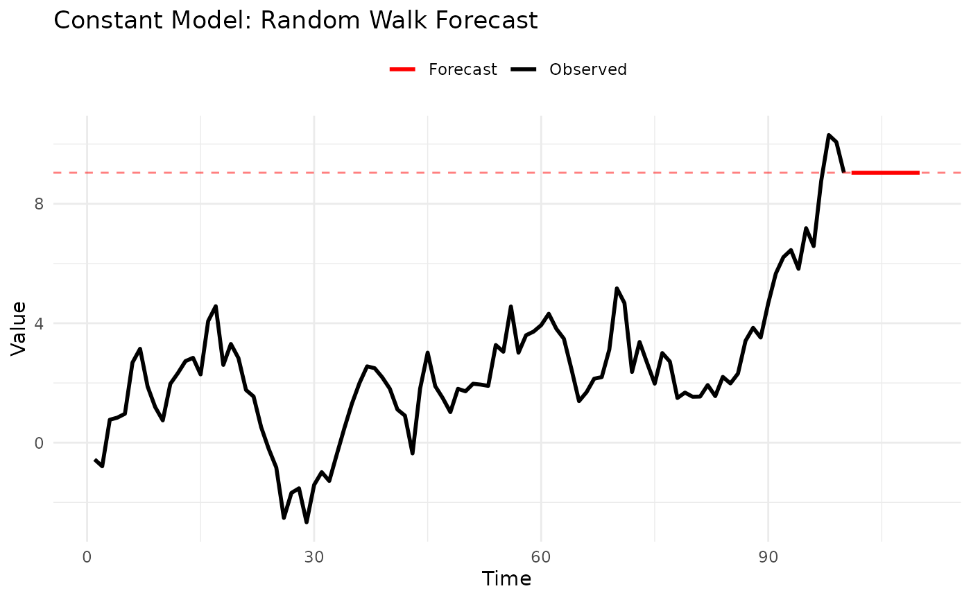 labs(title = "Constant Model: Random Walk Forecast", x = "Time", y = "Value", color = NULL) +