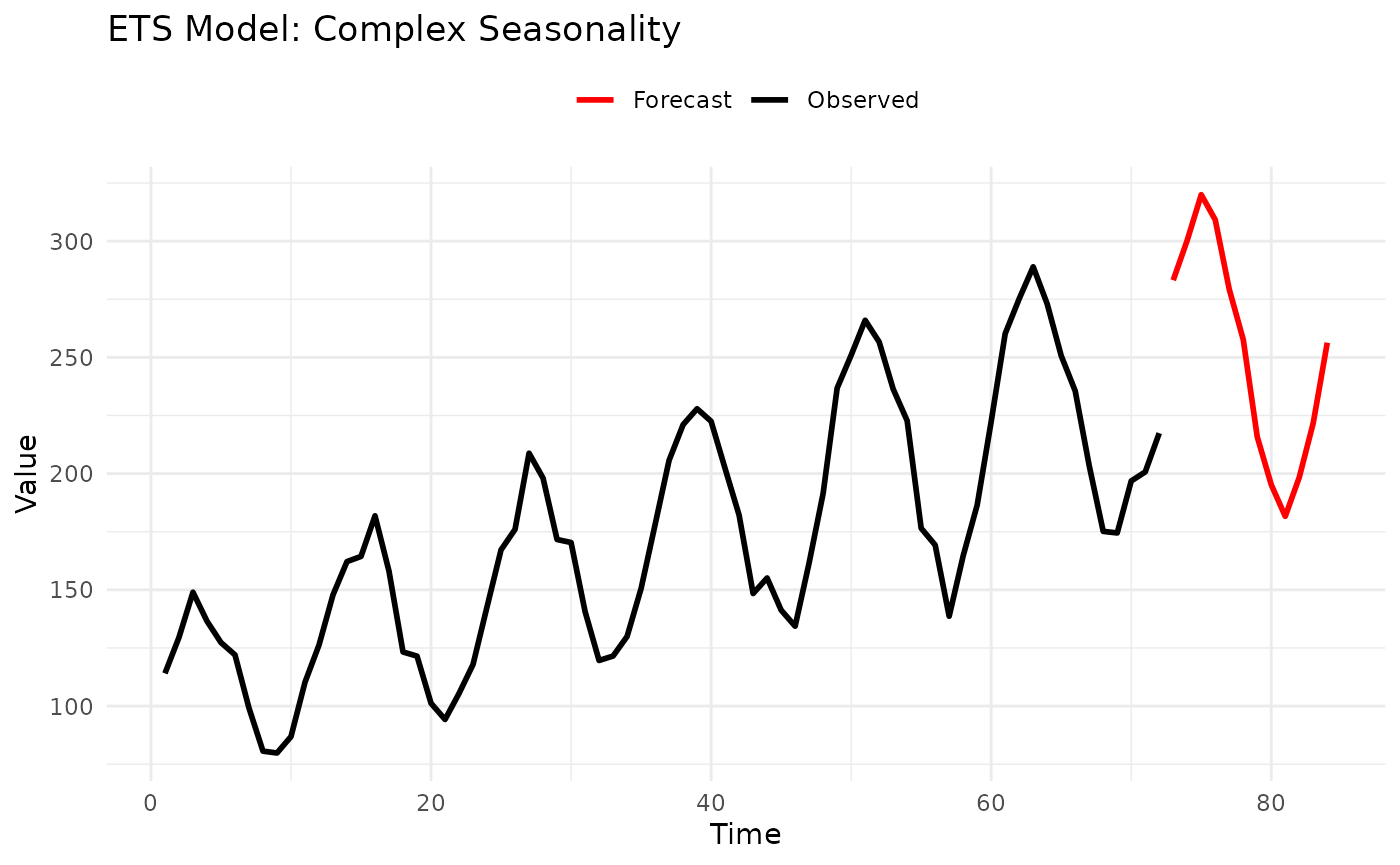 labs(title = "ETS Model: Complex Seasonality", x = "Time", y = "Value", color = NULL) +