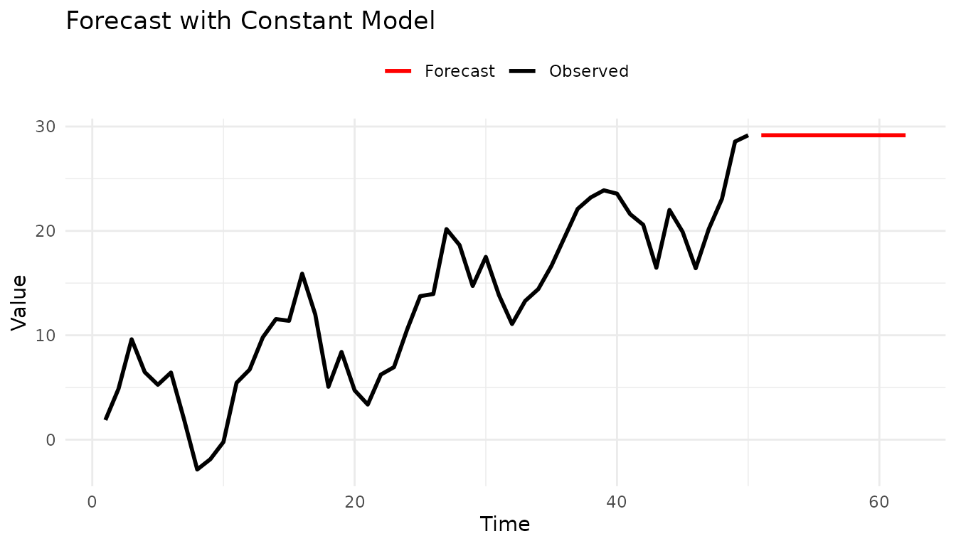 labs(title = "Forecast with Constant Model", x = "Time", y = "Value", color = NULL) +