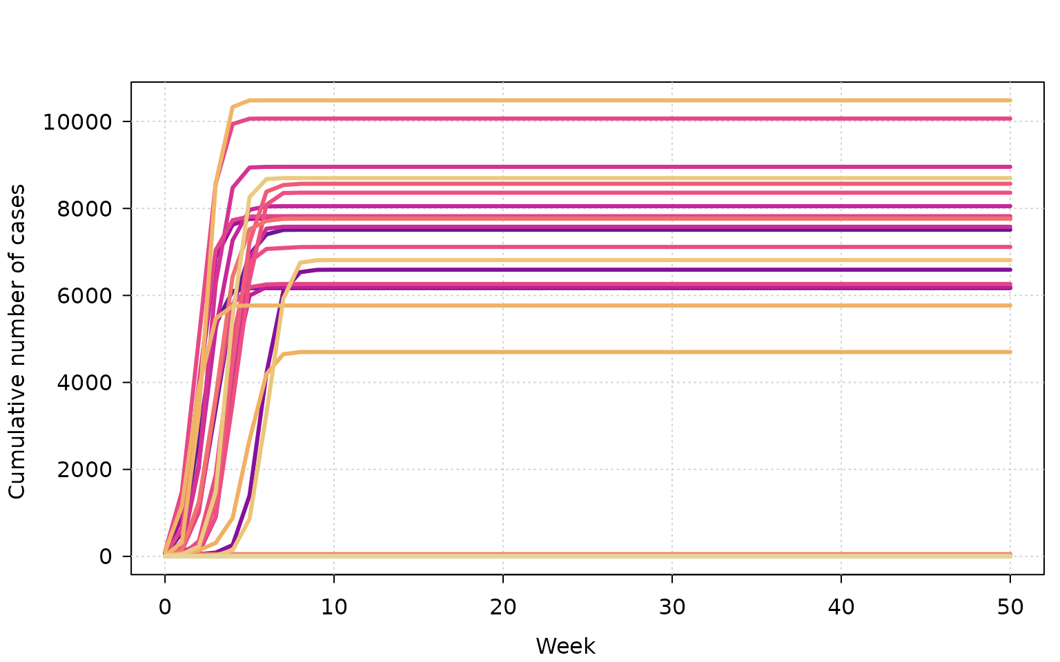 A simple way to explore results is to plot cumulative cases over time.